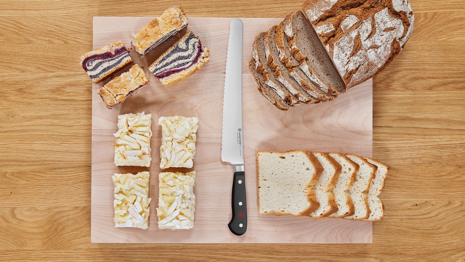 Ideal for cutting clean slices through as many different ingredients as possible: for large fruits and vegetables, meat or a smooth cut through cakes, pies and breads, the outwardly-curved, serrated edge of the Super Slicer blade allows for very fine cuts and prevents the foodstuffs from tearing or crumbling.